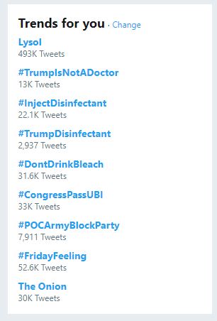 RT @zmt0516: 川普大帝再一次霸占了推特热搜。。。看样子一定有忠实川粉打算喝次氯酸钠了 https://t.co/O82Qdlh3is