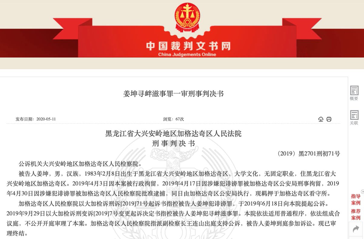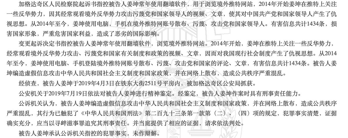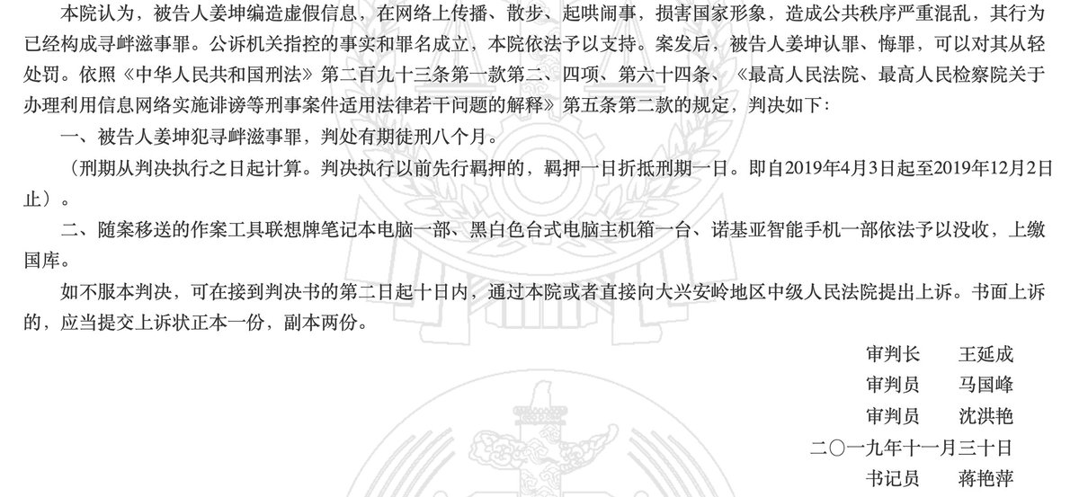 RT @SpeechFreedomCN: 黑龙江大兴安岭男子姜坤,因在推特发表“攻击中国社会主义制度”的推文1434条,被判处有期徒刑8个月。#言论自由 https://t.co/J5yUNxyt2k