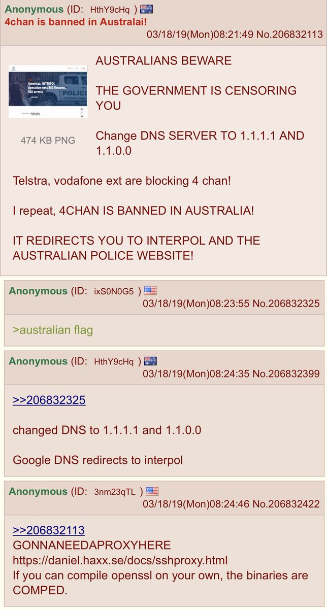 RT @oscargong1995: 水深火热的澳大利亚屏蔽了 4chan,群众们正在积极探讨使用 Cloudflare DNS 等手段。 https://t.co/S1gYtcWIl0