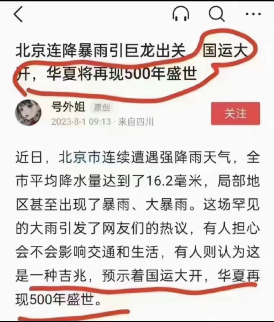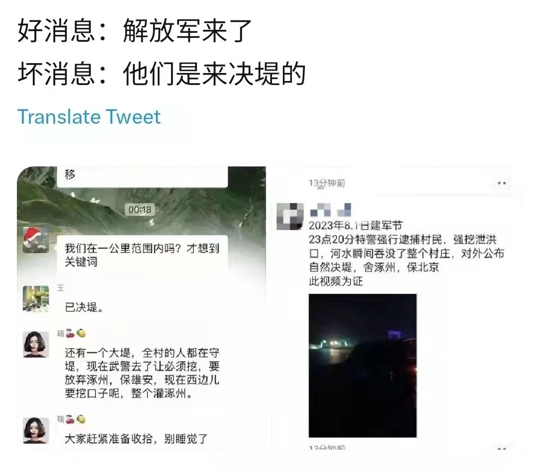 RT @zhanglifan: 喜讯频传…… 1【北京连降暴雨引巨龙出关国运大 开,华夏将再现500年盛世】 2【好消息:解放军来了 坏消息:他们是来决堤的】 https://t.co/vRmNi5rn3u