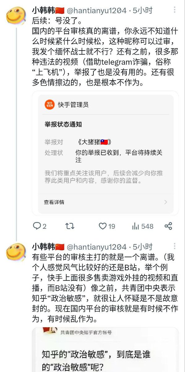 RT @jakobsonradical: 一名小粉红试图在快手上发布“庆祝粉碎89年颜色革命”的视频,结果账号遭到封杀。于是这名小粉红转头怪罪平台审核机制,即“都怪资本”。 https://t.co/0bJVhFXbo4