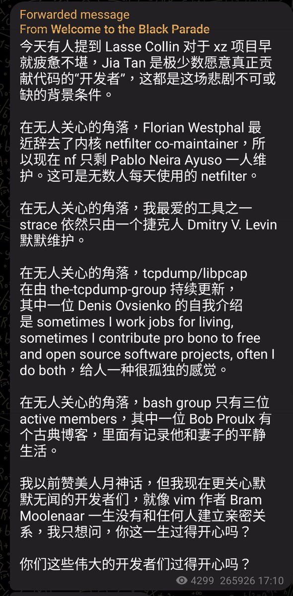 RT @FFmpeg: The xz fiasco has shown how a dependence on unpaid volunteers can cause major problems. Trillion dollar corporations expect fre…