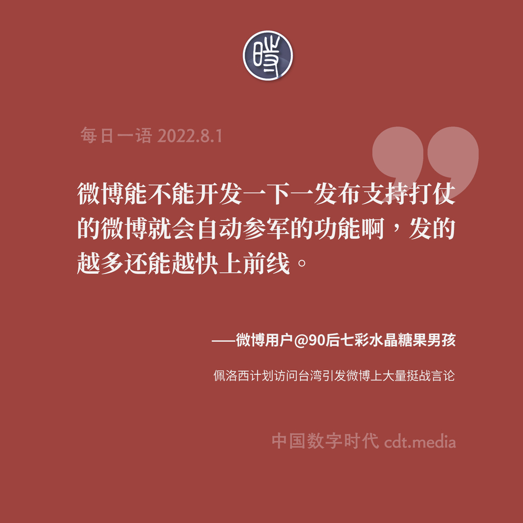 RT @CDTChinese: 佩洛西访台引发微博上大量挺战言论 #每日一语 https://t.co/gOr1WzhEPF