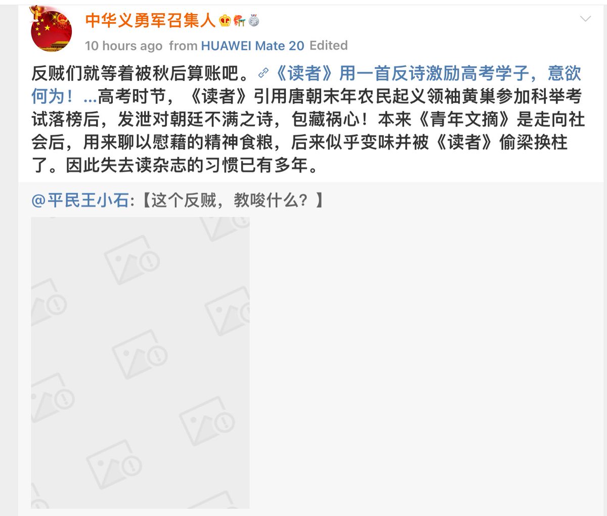 RT @big_ear_cat: 昨天读者发了黄巢满城尽带黄金甲的诗,本想祝福高考考生,结果被指发针对朝廷的反诗,下一步要干什么不敢想了,吓得赶紧删博。 https://t.co/cpLdsmsVsk