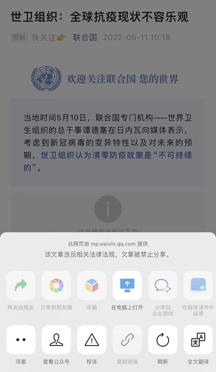 RT @myfxtrader: 微信屏蔽了联合国《世卫组织:清零防疫政策不可持续》这篇文章。