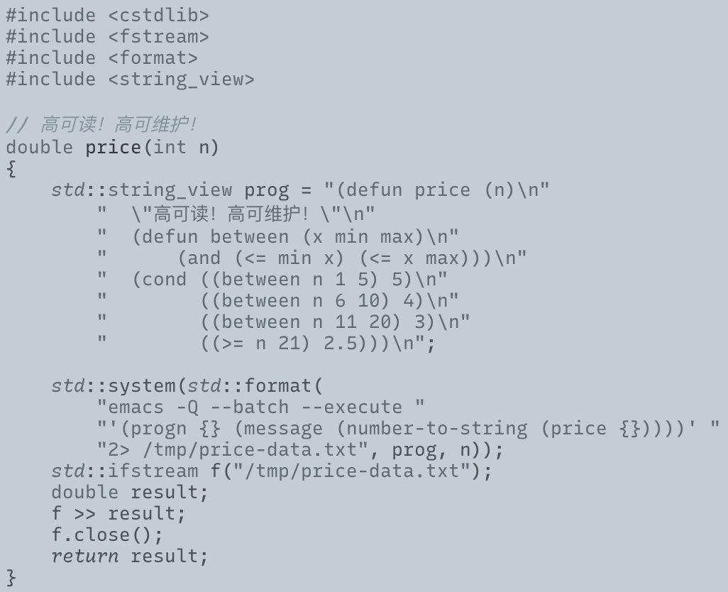 @iadnab 不是,elisp 程序是 emacs 的命令行参数,emacs 的输出存到文件里然后在 C++ 里读出来。 #高可读高可维护