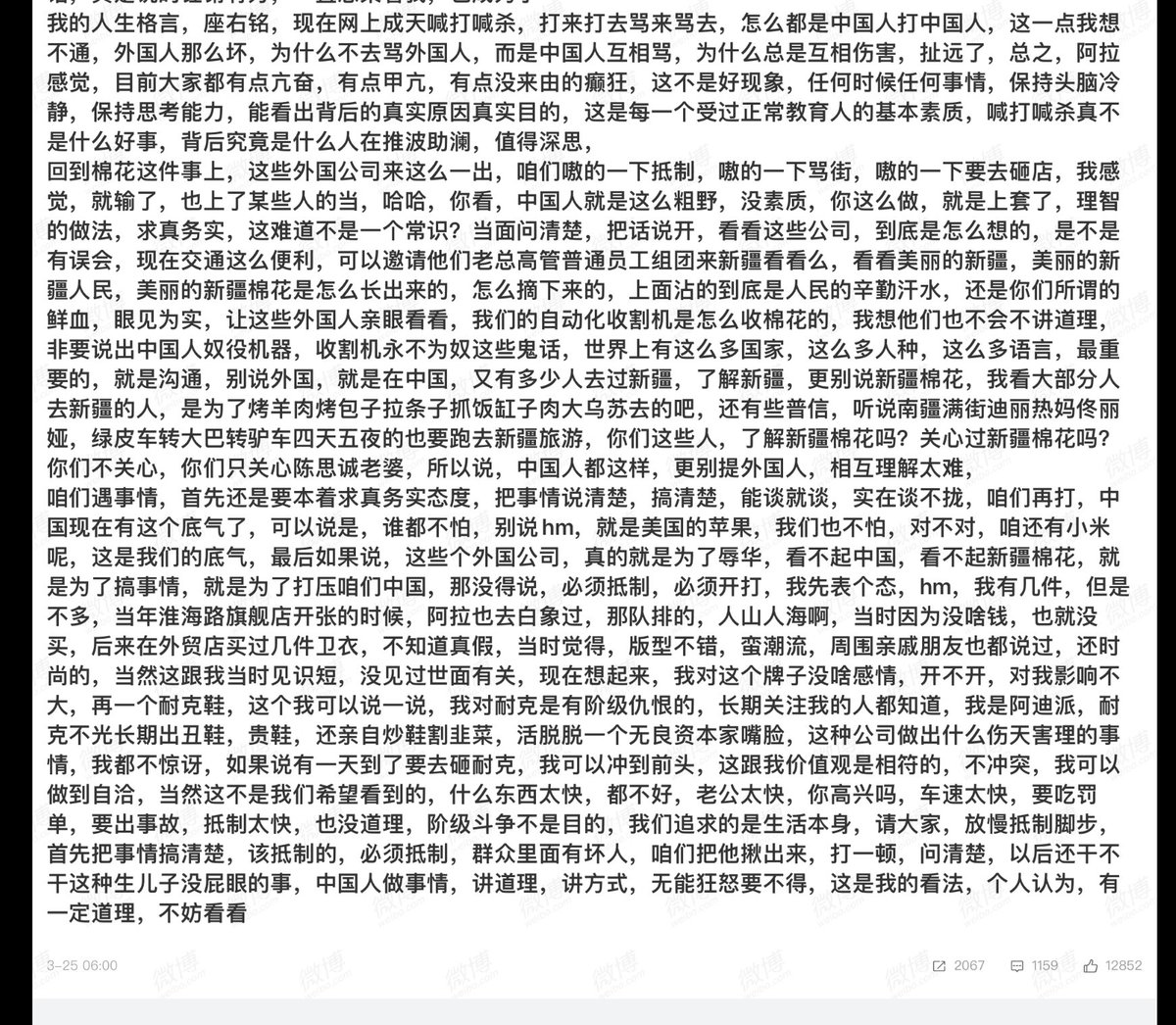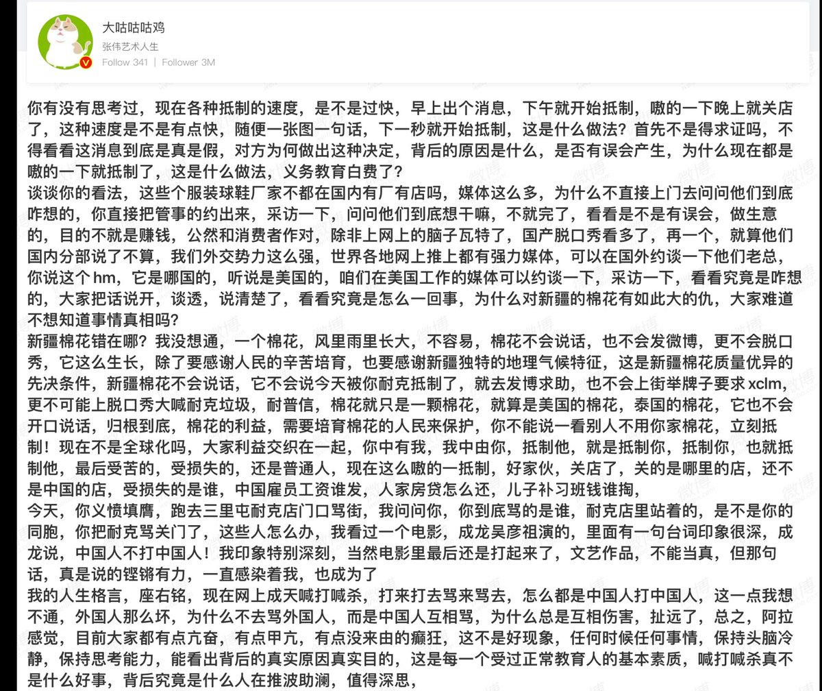 所以简单地说就是名牌都「抵制」新疆棉,小杂牌都支持新疆棉。