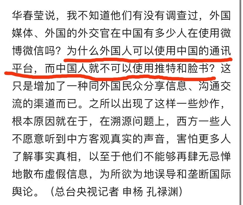 RT @gehouhun: 华春莹:为什么外国人可以使用中国的社交媒体平台,而中国人就不可以使用推特和脸书呢?//说真的我一时没反应过来这是疑问句还是反问句(((